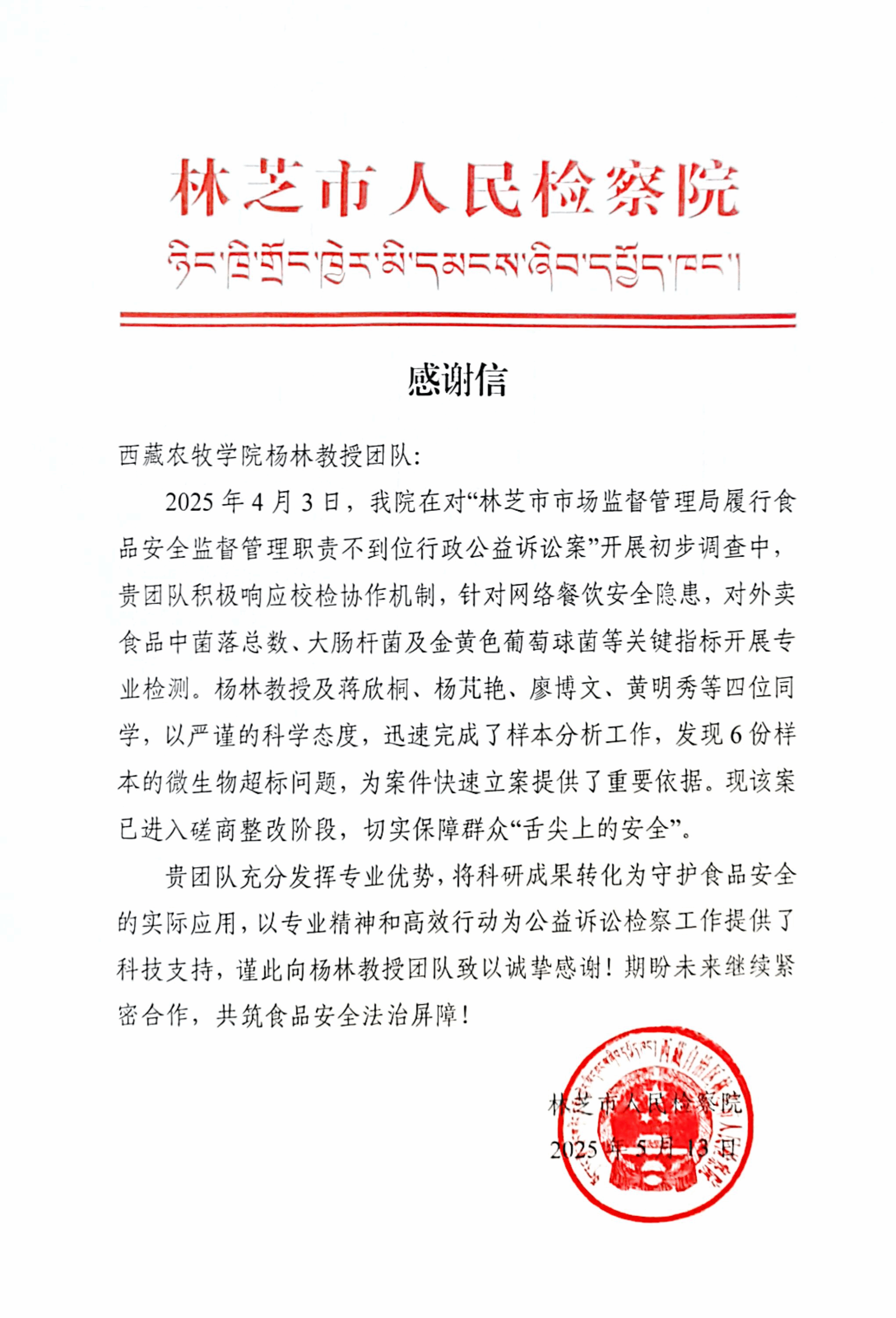 近日,我校在林芝市人民检察院案件办理中,积极落实校检协作机制,食品科学学院杨林教授团队协助林芝市人民检察院完成“外卖食品”样品中大肠杆菌等微生物检测工作,并向林芝市人民检察院提交包含各项微生物指标检测数据、安全评估结论,为案件立案提供了重要依据。5月13日,林芝市人民检察院向食品科学学院学院杨林教授团队发来感谢信。感谢杨林教授团队充分发挥学科专业优势,将科研成果转化为守护食品安全的实际应用,以专业精神和高效行动为公益诉讼检察工作提供了科技支持。
