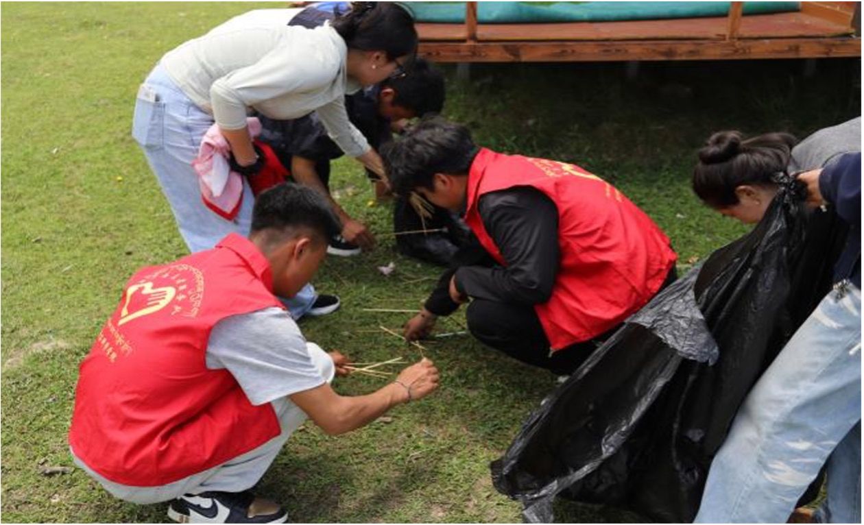 实践队的志愿者们为色沃村捡垃圾,维护村容村貌。