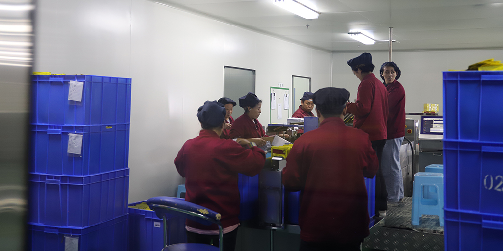 在奇正藏药工作人员的带领下,同学们依次参观了存放原材料的库房、研发室、生产加工及包装车间,由专业的讲解员带领我们了解生产加工及包装的过程,还品尝了奇正企业研发的林芝本地苹果脆。