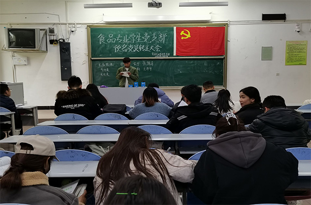 2021年10月29日下午18:30点,我院食品专业学生党支部于2101教室顺利召开了“预备党员转正”支部大会。会议主要讨论研究了关于扎西顿珠、郝亚兰、宋宁等9名同志转为正式党员的问题。出席本次会议的有食品专业学生党支部书记马少飞同志、支部全体在校党员及预备党员。