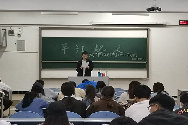为强化党史学习教育目标,加强广大学生党员的党性,深入回顾党的历史,重温党的光辉历程,食品科学学院学生党支部特于2021年9月3日下午18:00在2101教室开展了以“平江起义”为主题的第十六次集中学习党史教育活动。全体在校党员与会,此次会议由支部成员孙自立同志主持。