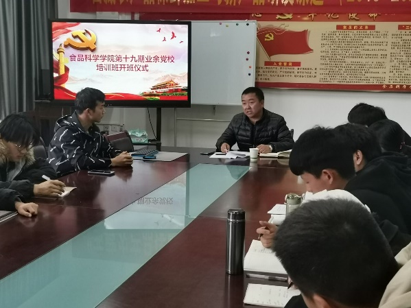 为进一步加强我院入党积极分子对党的基本理论知识系统教育,提高入党积极分子的理论水平,确保新党员的发展质量。我院业余党校第十九期入党积极分子培训班开班仪式于2021年4月23日18:00,在食品科学学院会议室举行。参加本次开班仪式的有我院党委副书记索朗才旺同志、食品专业学生党支部书记马少飞同志、食品专业学生党支部副书记程秀峰同志、生技专业学生党支部干部王云波同志以及37名培训学员。