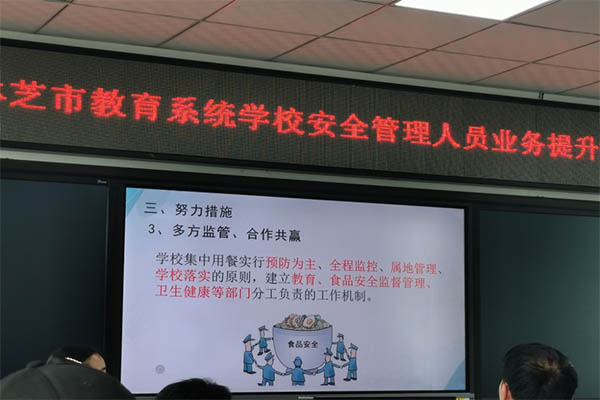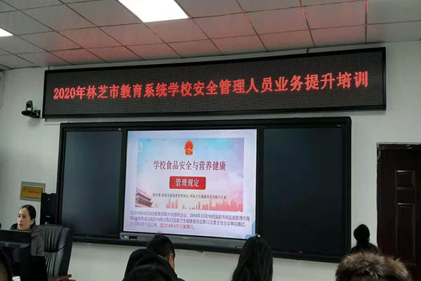 2020年11月30日,食品科学学院教师池福敏副教授受林芝市教育局邀请,在“2020林芝市教育系统学校安全管理人员业务提升培训”会上,为各区县教育局、市直学校和部分县区中小学校管理人员共50余人作题为“守护师生舌尖上的安全”的知识讲座。池福敏老师首先向大家分析了我国食品安全的现状,并通过生动的案例分析介绍了影响食品安全的因素,然后向大家就《学校食品安全与营养健康管理规定》中的亮点内容,并结合林芝中小学校的现状进行了解读,最后向培训学员介绍了食品安全的管理措施。