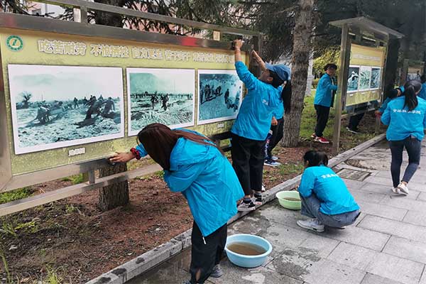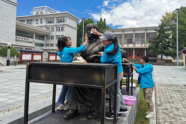 活动期间,全体参加活动的同学们以认真负责的态度积极地投入到此次义务擦拭展板活动中,尽管天气炎热,但这也更加磨练了大家的意志,大家认真仔细的用抹布擦拭文化长廊两边的展板以及大礼堂广场上的铜像,最终,在大家的共同努力下,使得展板更加的干净、整洁、美观。