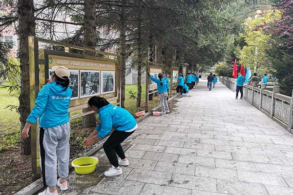 为深入开展“四讲四爱”主题教育实践活动,让广大青年学生党员牢固树立“讲贡献 爱家园、讲文明 爱生活”意识,用实际行动美化校园环境,积极发挥党员先锋模范作用,我支部于2020年8月12日下午13:30,在学校筹建路及大礼堂广场进行了义务擦拭文化长廊校史展板志愿服务活动。食品科学学院学生党支部入党积极分子、党员工作站、学生会、青年志愿服务队的成员们在食品专业学生党支部书记马少飞同志的带领下积极开展了此次志愿服务活动。