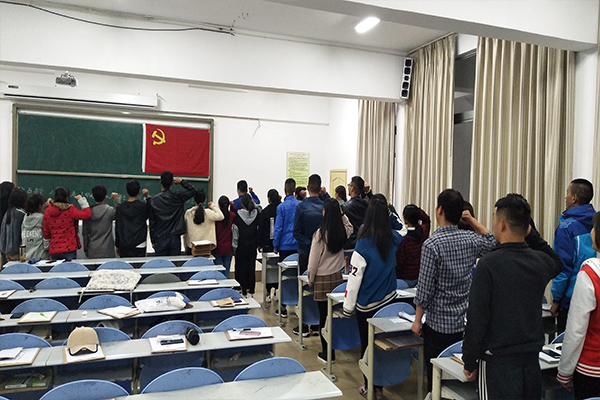会议由食品专业学生党支部书记马少飞主持,会议严格遵守以下程序:(1)发展对象宣读《入党申请书》,并向大会作汇报;(2)入党介绍人发言介绍;(3)支委会报告审查意见;(4)与会党员酝酿讨论;(5)到会有表决权的党员对发展对象能否接收为预备党员进行无记名投票,此次会议由田惠鑫计票、付家霖监票;(6)支委会根据票决结果提出意见,提交支部大会讨论通过,并形成支部大会决议,会议全票通过17名发展对象的入党志愿。决议后,全体与会党员进行了入党宣誓,会议最后,马少飞同志向新加入党的队伍的同学表示欢迎并提出了新的要求。