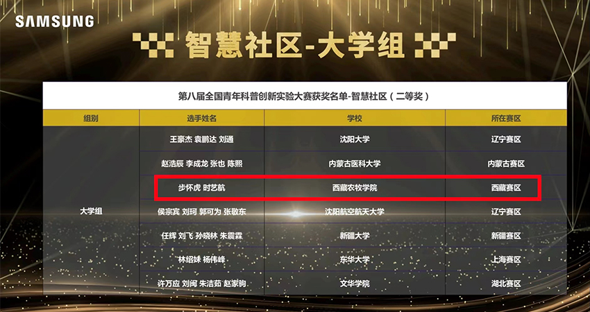 我院高度重视,鼓励学生参与第八届全国青少年科普创新实验暨作品大赛,加强对参赛作品跟踪指导,为学生顺利完成比赛创造条件。今年五月,我院步怀虎、时艺航两位同学的参赛作品以西藏自治区复赛一等奖成绩获得代表西藏赛区参加总决赛的名额,随后参赛团队又对参赛作品进行反复试验论证、修改完善。决赛当日,参赛同学详细全面讲解了作品原理功能以及创新点,沉着冷静的回答评委提问,稳定发挥,展现了扎实的知识功底和较强的综合素质,最终取得傲人成绩。