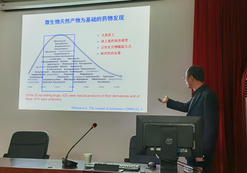 宋福行教授主要从事微生物活性次级代谢产物筛选及其作用靶点和机制研究,在本领域内有影响力的国际期刊上发表论文70多篇,获得授权专利24项。宋福行教授从微生物天然产物为基础的药物发现、海洋天然产物研究的兴起到真菌和放线菌中活性天然产物鉴定及具有抗结核活性的新的含硫深海霉素化合物,为我校师生既科普了微生物天然产物药物基础知识,探讨了海洋天然产物的研究热点。
