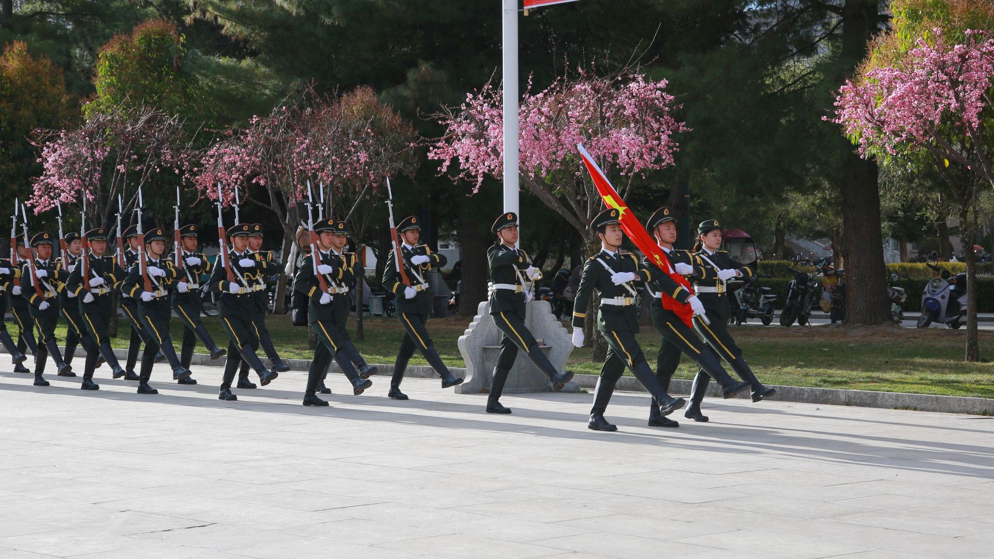上午9时,升国旗、唱国歌仪式正式开始。国旗护卫队精神抖擞、迈着铿锵有力的步伐护卫着国旗迈步到升旗台。在庄严的国歌声中,鲜艳的五星红旗冉冉升起,全体师生列队整齐、精神焕发,神情肃穆,面对庄严的国旗行注目礼,用洪亮的声音唱响国歌,感恩伟大时代,汲取奋进力量。
