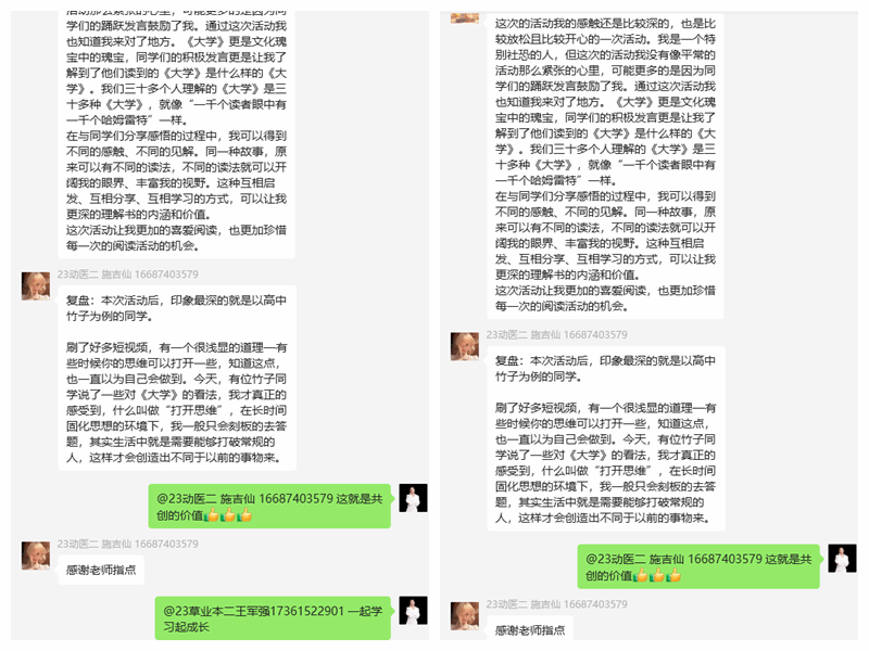 然后,此次活动特别邀请两位特别嘉宾参加了这次活动。蔡雯西星级演讲教练用空杯心、感恩心、美好心三颗星告诉我们,学习阅读演讲要空杯坚持,顶着感恩之心多读书,丰富内心来学习增长知识,培养气质,拥有强大的本领,具备走出去,观世界的勇气,不忘初心,砥砺前行,而湖南农业大学的张家银老师从自身的故事,为我们讲述了阅读与演讲带来的改变,他们的故事充满了感动和鼓舞,让在场的每一个人都感受到了阅读的力量,也激发了对知识的渴望。同学们积极参与了《大学》读后感的讨论。他们分享了自己的见解和感悟,现场气氛热烈。