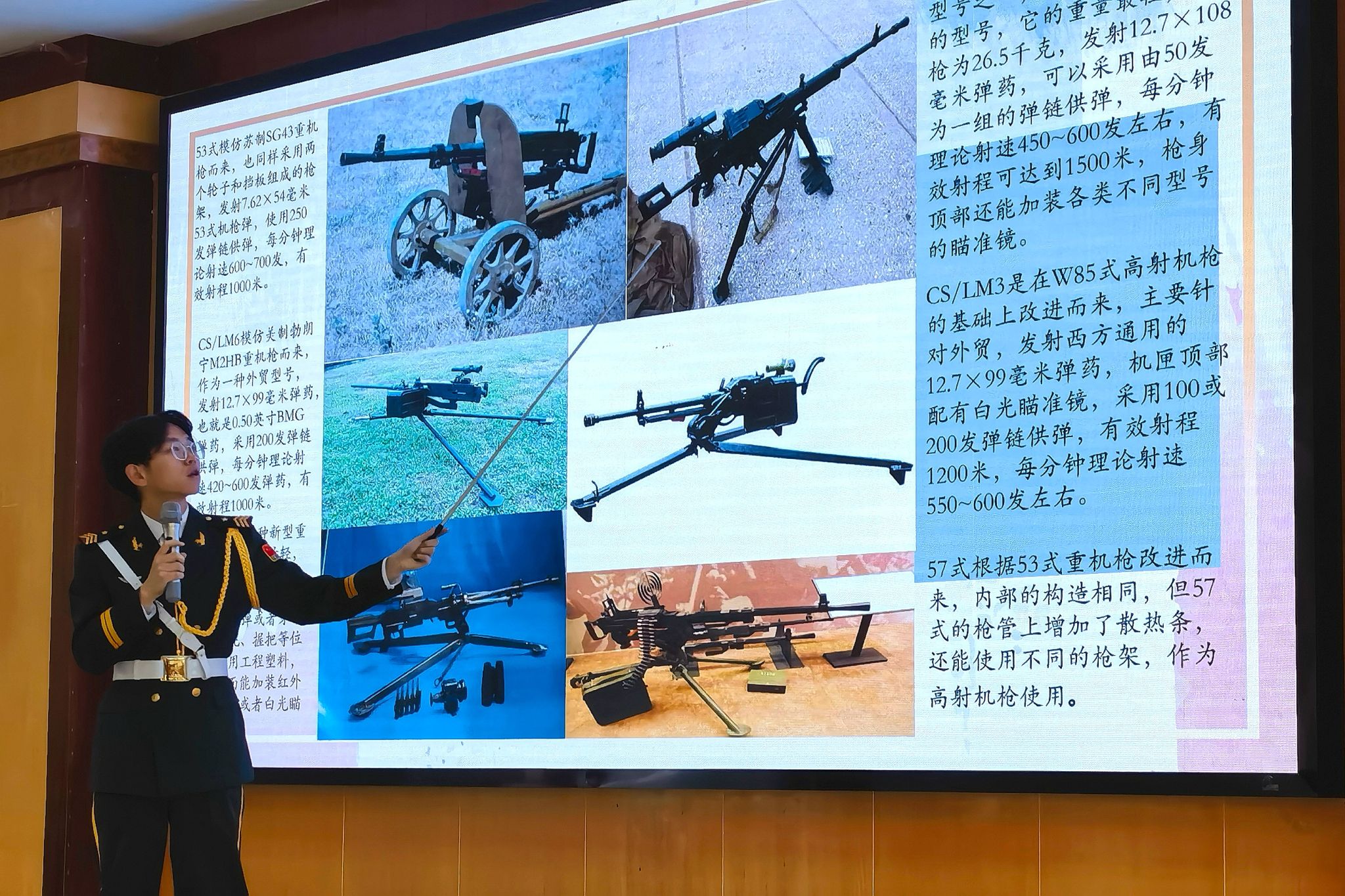 国防教育协会成员胡杨阳为参与学生介绍机枪、狙击步枪等枪械知识。期间,讲解员就一些大家较为熟悉的枪支样式随机提问观众,参与学生认真听讲,积极参与互动。协会讲解员马铭泽、姜军彤讲解展示枪支模型的具体结构、使用并进行狙枪动作展示。讲解完后同学们上台感受模型和激光模拟射击,通过操作体验感受国防科技的魅力。