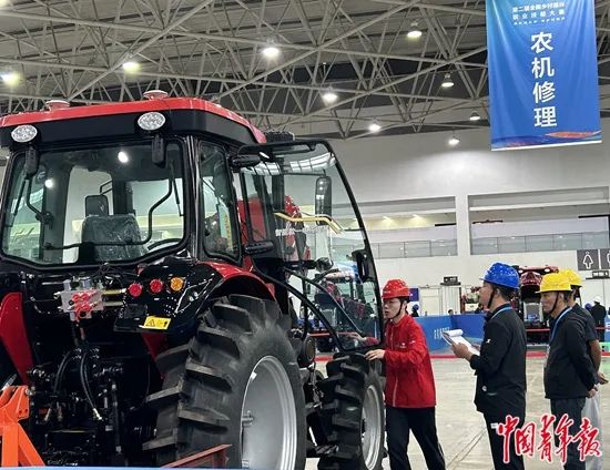 “乡村新职业是就业新亮点,对于乡村振兴具有积极推动作用。”人力资源和社会保障部职业能力建设司相关负责人王晓君,担任第二届全国乡村振兴职业技能大赛组委会副主任,据她介绍,目前已开发了13个与乡村振兴相关的新职业,包括电子商务、直播电商、民宿管家,还有让农事信息全部实现网上监管的农业数字化技术员、操控无人机完成农林巡视工作的无人机驾驶员、运用现代企业管理理念对乡村资源进行整合优化的农业经理人等。越来越多的新职业折射出乡村新业态的繁荣发展,成为助力乡村振兴的新生力量。老家在贵州省毕节市威宁彝族回族苗族自治县的00后王胜勇,一直记得小时候跟着父母务农时的情景。他最喜欢坐在拖拉机的后斗里,听着“突突突”的轰鸣声响彻田野。然而拖拉机经常出故障,一不小心就压坏地里的麦子,父母经常为此急得满头大汗。那时的他就在想,长大后一定要把这些机器弄懂。小时候埋下的种子,如今已发芽抽枝。作为贵州农业职业学院学生的王胜勇,在5月上旬举办的第二届全国乡村振兴职业技能大赛(以下简称“第二届全国乡村振兴大赛”)上,夺得农机修理学生组金牌。第二届全国乡村振兴大赛由人力资源和社会保障部、农业农村部、贵州省人民政府共同主办,以“展技能风采、促乡村振兴”为主题,来自全国的701位选手在砌筑、农机修理、电子商务等11个比赛项目中展开激烈角逐。