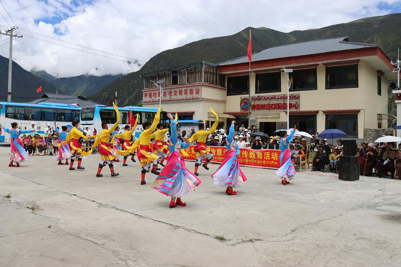 早上9:30下乡队伍乘车从学校出发,11:50抵达实践地林芝市百巴镇开朗村。刚下车,同学们就忙活了起来,开始布置演出场地,把精心准备的《扎西秀》《踢踏舞》《月光仙女》《颂歌新西藏》《松紫玛》等10个歌舞节目呈现给村民,演出绘声绘色、热情动感、不时互动,赢得了阵阵喝彩和掌声。演出间隙学校团委书记白玛卓嘎、副书记普旺堆代表学校团委向17户五保户、建档立卡户家庭赠送了大米、面粉、食用油、砖茶、被褥、抽纸等生活用品,切实帮助他们解决到实际生活问题,助力巩固脱贫攻坚成果;向72名儿童赠送了书包、文具盒、笔本等学习用品,为学生逐梦翱翔增添助力,鼓励学生好好学习,将来用大爱来回报社会。慰问演出结束后,资源与环境学院副院长、园艺学教授王忠红带领农学专业学生走访村民温室大棚,了解村民种植蔬菜瓜果种类,耐心细致针对性讲解蔬菜栽培技术;电气工程学院扎西顿珠老师针对农户电路老化用电安全问题进行了讲解,预防兽医专业普旺堆老师结合专业知识介绍家禽家畜寄生虫病的危害,对养殖驱虫等常识进行讲解,发放兽药350包(瓶);其他队员宣传党的惠农政策、民族团结政策,发放宣传单350份、政策宣传手册350本。