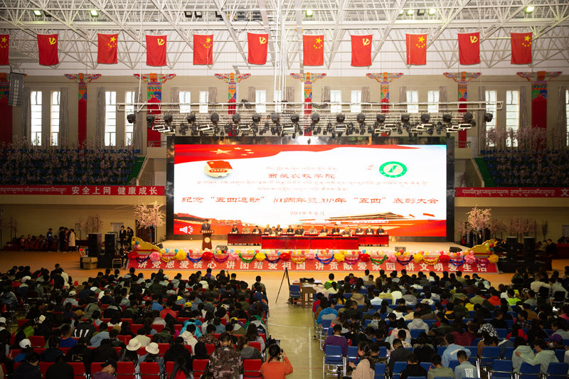 在五四运动100周年之际,为进一步传承和弘扬五四精神,树立典型、表彰先进,鼓舞和激励广大团员、团干部勤奋学习、扎实工作,推动基层团组织各项工作更加扎实、全面、深入地开展,院团委于2019年5月4日18:00,在文体馆开展了纪念“五四”运动100周年暨2019年“五四”表彰大会。大会由院党委委员、副院长赵垦田同志主持,院党委副书记、院长高学同志,院党委副书记、副院长王春春同志,院党委委员、纪委书记边巴次仁同志以及党委宣传部、人事处、教务处、学工处、招就处、研究生处、院工会和各二级学院(部)主要领导同志出席大会,青年师生近2600人参会。