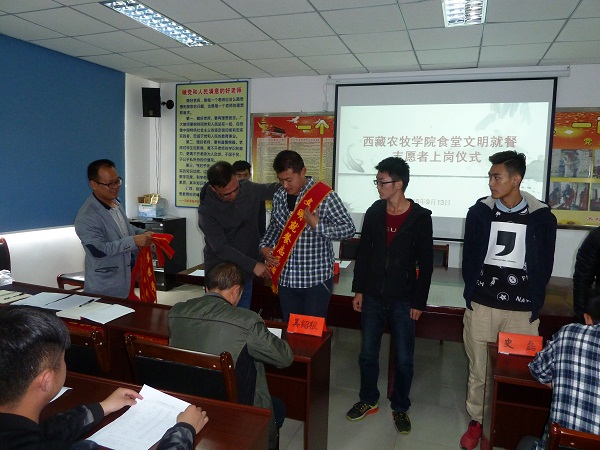 此次上岗仪式的举行,标志着我院文明就餐教育引导活动正式启动,40余名志愿者将在两个学生食堂开展“有序排队、文明就餐、厉行节约、自觉回收餐具”等方面的宣传引导工作。