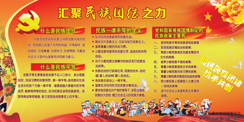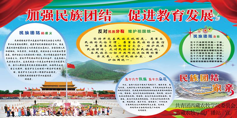 为大力宣传党的民族理论和民族政策,积极培养各族学生的民族团结意识,提高各族学生维护祖国统一的自觉性,根据学院《关于大力推进维护祖国统一,加强民族团结教育的通知》精神,院团委、学生社团联合会于近期举行了民族团结展板大赛。