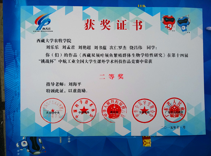 经过专家评审、作品复审、现场问辩等多个环节激烈紧张的角逐,最终,由我院刘海平副教授指导,刘乐乐、刘艳超等同学完成的作品《西藏双须叶须鱼繁殖群体生物学特性》获得了竞赛二等奖,西藏自治区共有两件作品获得二等奖,另一个花落西藏大学。刘海平副教授也同时获得了第十四届挑战杯“优秀指导老师”荣誉称号,并于11月21日赴香港科技大学参加了国际大学生创新创业峰会,这也是西藏自治区唯一一件入围参加赴香港国际大学生创新创业峰会的作品。