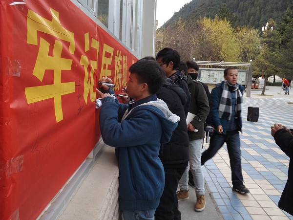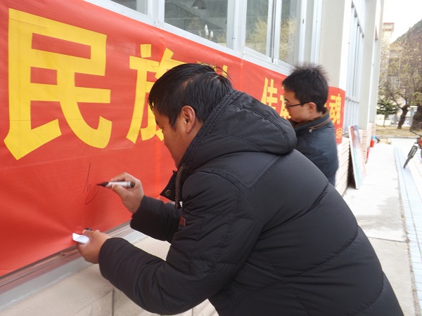 院团委书记达瓦老师在横幅上签名