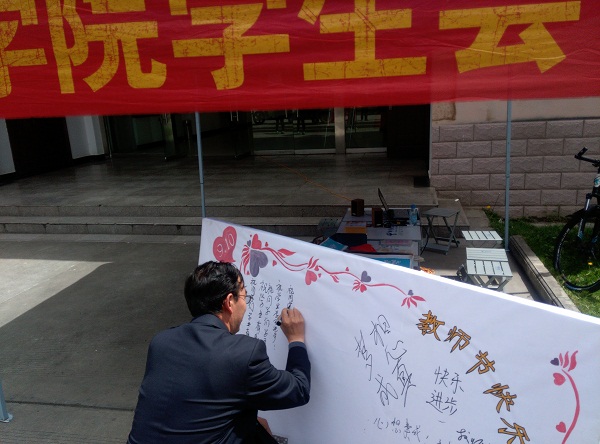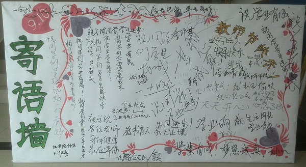 为庆祝第三十个教师节,向无私奉献、辛勤耕耘的老师表达节日的祝福和内心的感激,2014年9月10日,院学生会开展了“感师恩、送祝福”系列活动。