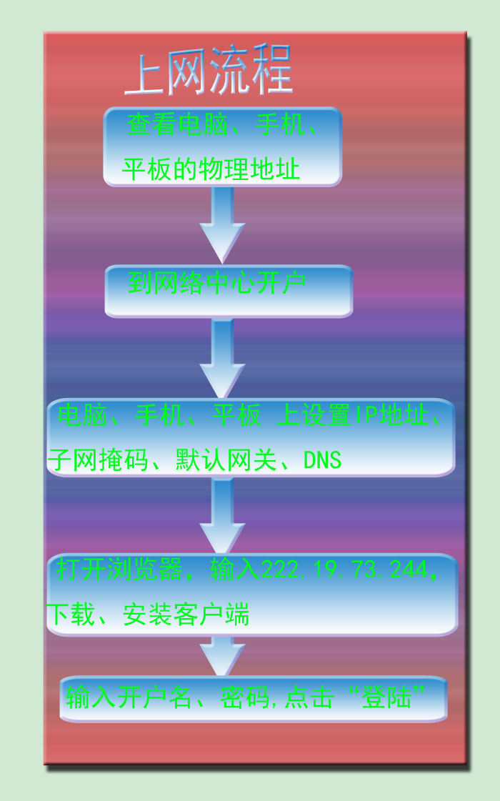 教职工在职工区办理入网手续,需要提供终端(电脑、手机、平板)的物理地址、姓名、联系电话、身份证、楼宇号、单元号、学院。