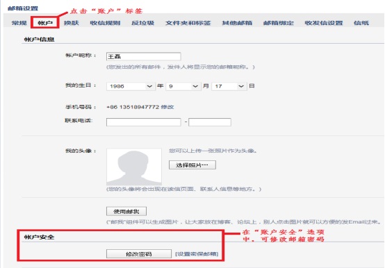 在邮箱设置界面,选择“账户”标签,下方的“账户安全”中可修改邮箱密码(之后如需要使用账号密码登陆,请在此处修改邮箱密码,设置密码时一定要使用复杂密码。)