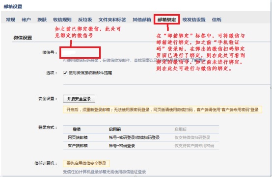在“邮箱绑定”标签中,可将微信与邮箱进行绑定,如之前“手机验证码”登录时,在弹出的微信扫码绑定界面已进行了绑定,则在此处可看到绑定的微信号,如之前未进行绑定,则在此处可进行与微信的绑定。