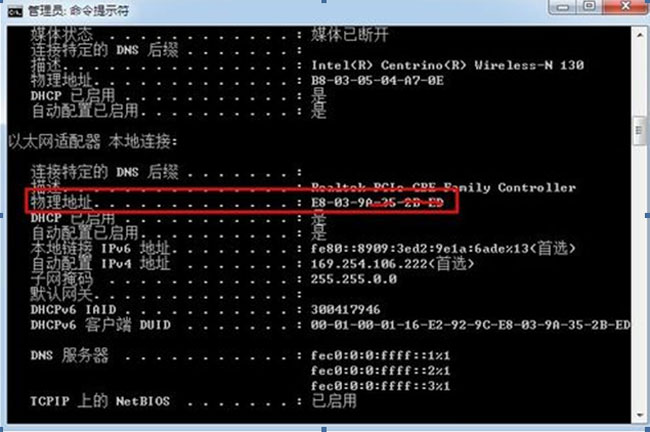查看返回信息,如图所圈中的部分,物理地址即为本机MAC地址。