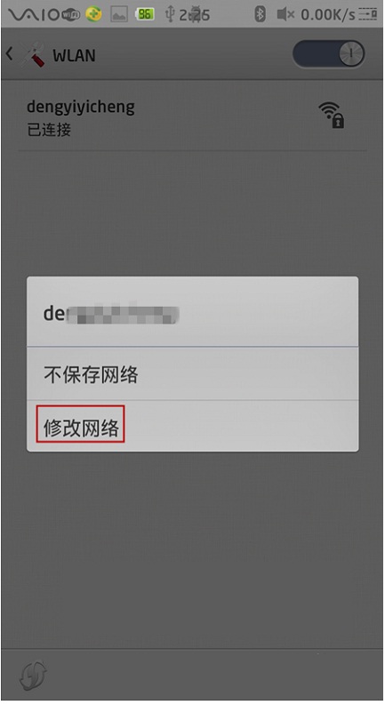 3. 这时候有个无线网络连接的信息显示,这里是连接上wifi了的,没连接上wifi的只要显示有wifi信号下面步骤都一样。一直按住这个连接上或者是未连接上的wifi信号图标。