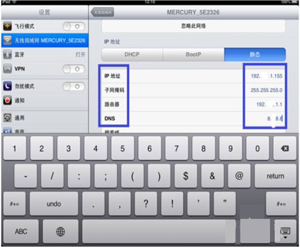 5. 然后点击 IP 地址一栏,依次输入从网络中心分配的 IP地址,子网掩码,路由器(这里指的是网关)和DNS地址。IP信息设置好以后,点击“无线局域网”返回,如图所示。