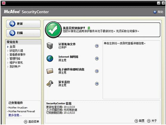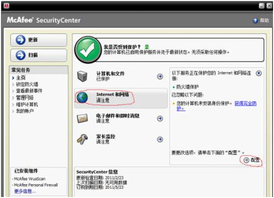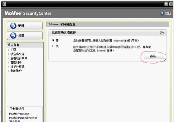 1.打开McAfee界面,选择“Internet和网络”,点击“配置”,再点击“高级”