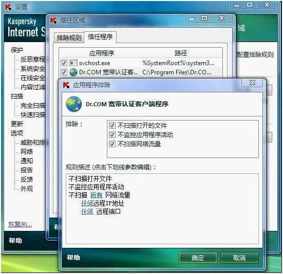 一般情况下,只需要把客户端安装目录底下的ishare_user.exe和drcomdll.dll文件设置为受信任的程序(也可以整个客户端安装目录设置为信任目录),问题解决。