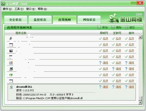 需要在金山网镖的应用规则里面,添加客户端安装目录底下的ishare.exe和drcomdll.dll文件设置为“允许访问局域网”“互联网”“邮件”等规则,如下图所示: