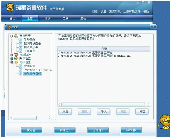 瑞星详细设置里有个“高级设置”选项,在排除查杀目标里面添加如下图内容(客户端安装目录以及客户端安装目录底下的drcomdll.dll文件)就可以解决瑞星误杀问题: