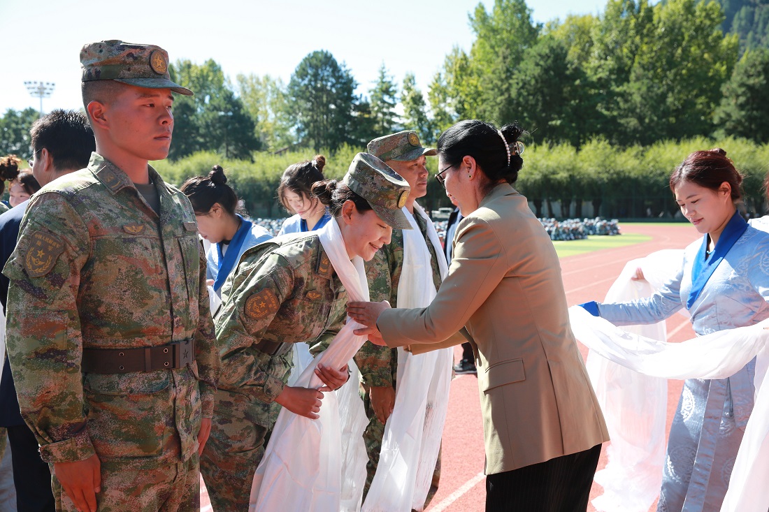 在雄壮的国歌声中,大会正式拉开帷幕。近3000余名参训学生军容严整、步伐铿锵、口号响亮、士气高昂、斗志昂扬地进行军训成果展示,充分展现出朝气蓬勃、奋发向上的精神风貌。副院长郑维列宣读了《关于表彰2023年学生军训先进集体、先进个人决定》,党委副书记、院长强巴央宗和与会嘉宾为获得表彰的集体和个人颁发了荣誉奖牌和证书。校领导向45名军训教官敬献哈达,强巴央宗同志代表学校向林芝军分区赠送锦旗。