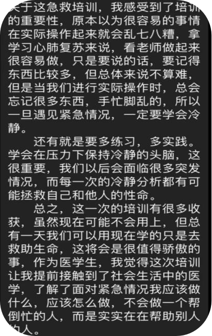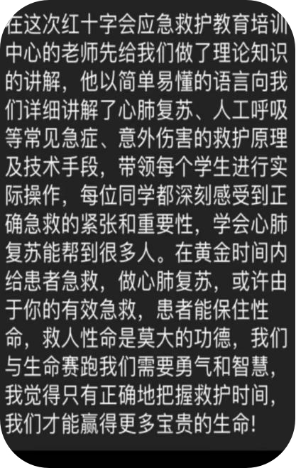 培训师生纷纷表示此次急救培训是一次生动且富有实效的生命健康教育。通过理论知识学习和实践演练,不但能够学到具有实效作用的救护知识,同时增强了急救应变能力。