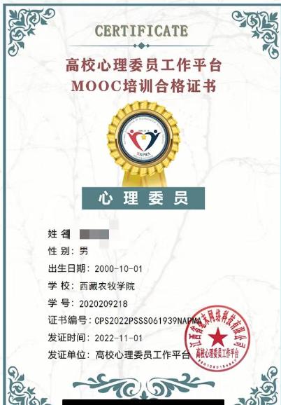 为进一步完善学校心理健康教育四级网络体系,加强心理健康教育学生骨干队伍建设,充分发挥班级心理委员的朋辈辅导和基础预警作用,提高班级心理委员的工作能力和工作水平,近期,学生工作处大学生心理健康咨询中心组织开展2019级、2020级和2021级班级心理委员MOOC培训认证工作,共132名心理委员参加,132人通过考核认证获得结业证书。