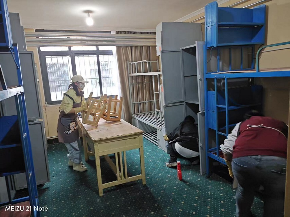 活动伊始,各位同学带着清洁工具细致清扫新生宿舍,从地面灰尘到窗户玻璃,从擦拭床、衣柜到桌椅摆放,不放过任何角落。活动过程中同学们热情高涨,对宿舍区草丛垃圾、落叶进行了清理,负责车棚管理的同学将车棚内自行车摆放整齐并清扫杂物。最后在同学 们的共同努力下,宿舍区焕然一新。