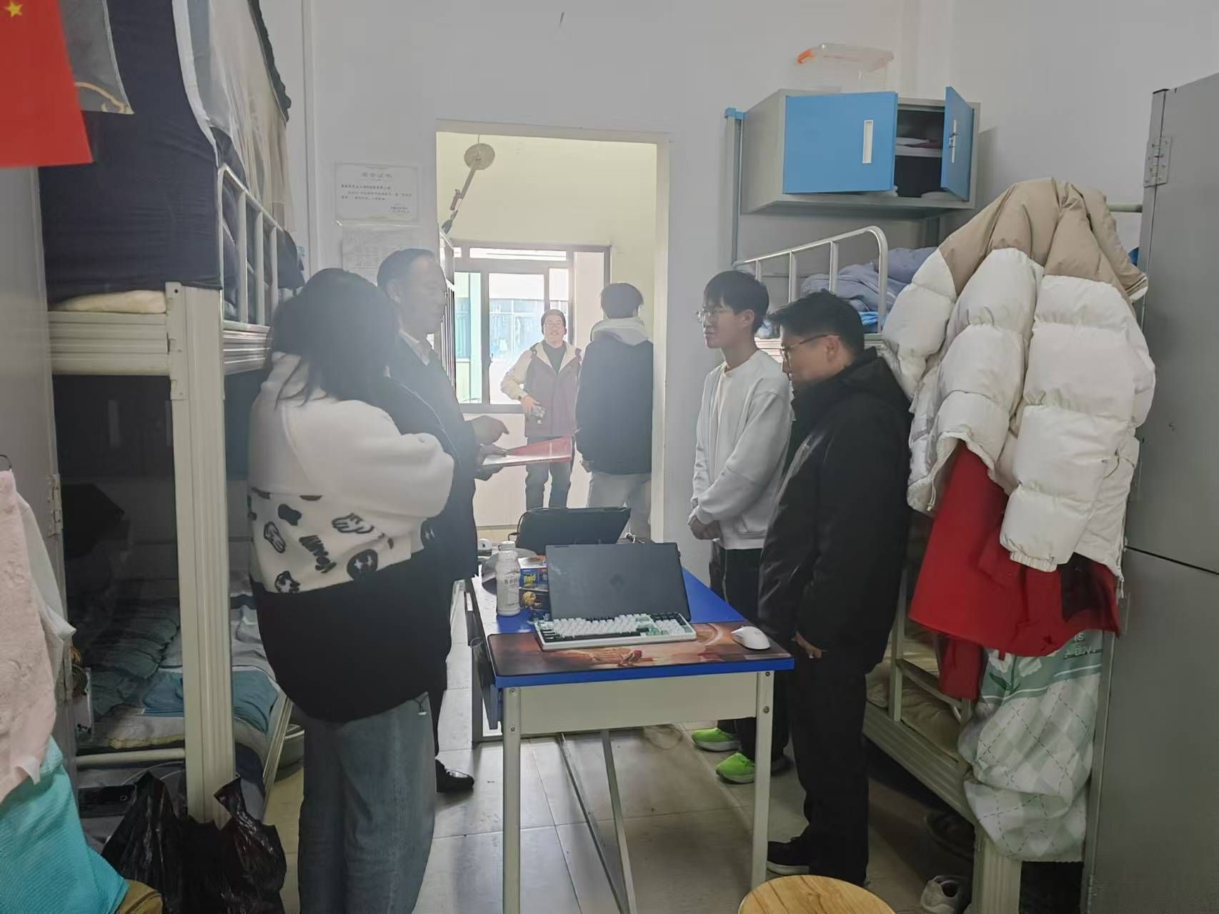 其次是9栋205宿舍模拟发现非法出版物设计,情况发生后,迅速通知县处级领导干部楼长、分管学生工作副书记、辅导员、班主任、宿管科工作人员、宿管员、宣传部领导、安保处领导、学工处领导到达现场。对非法出版物来源及传播情况进行排查,并按照流程调查参演学生的日常学习、生活、思想动态、行为轨迹。同时,对宿舍其他成员进行排查,对宿舍成员进行教育引导和舆情控制,演练结束后,指挥部组织参演人员总结,针对问题整改。