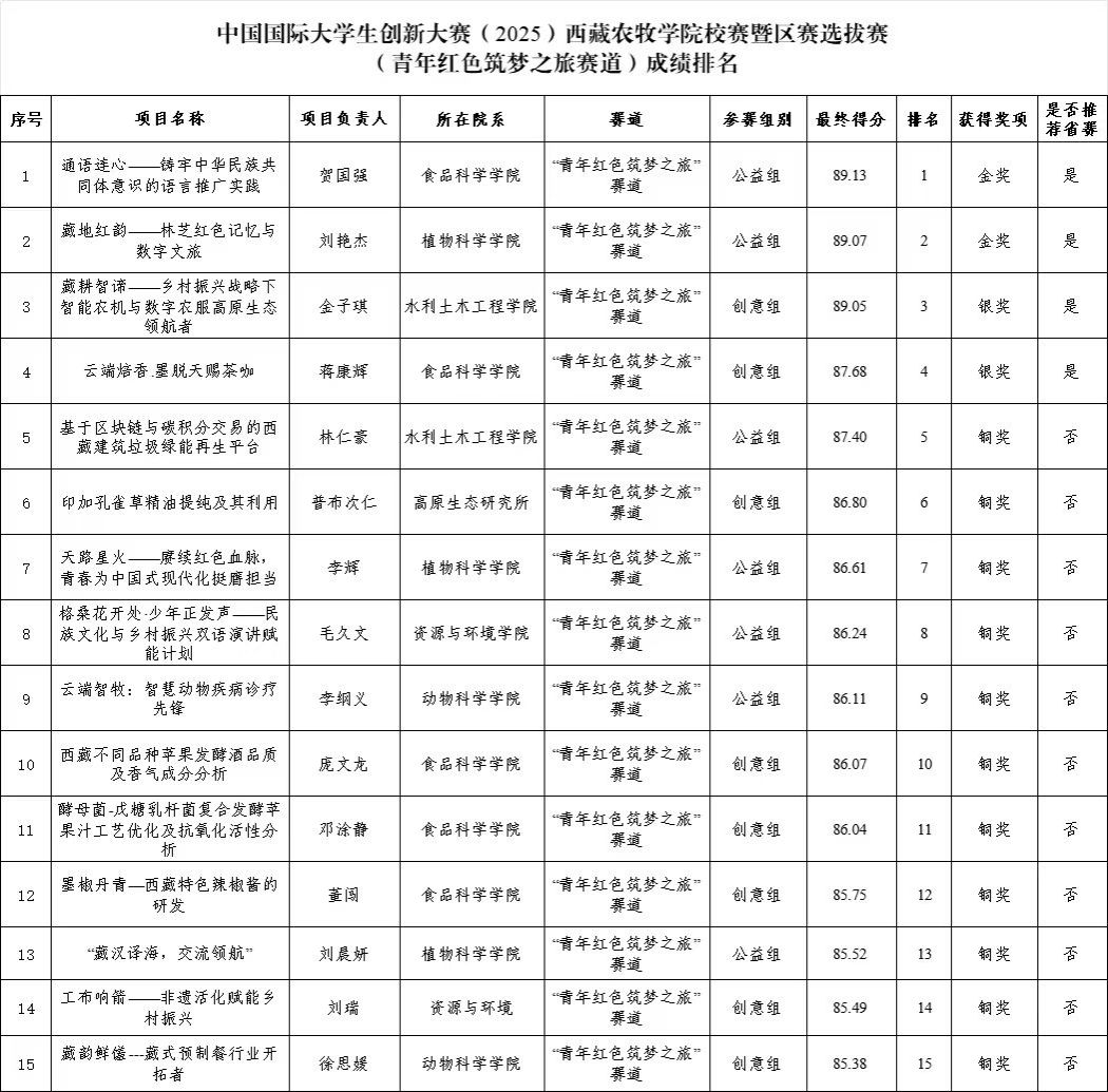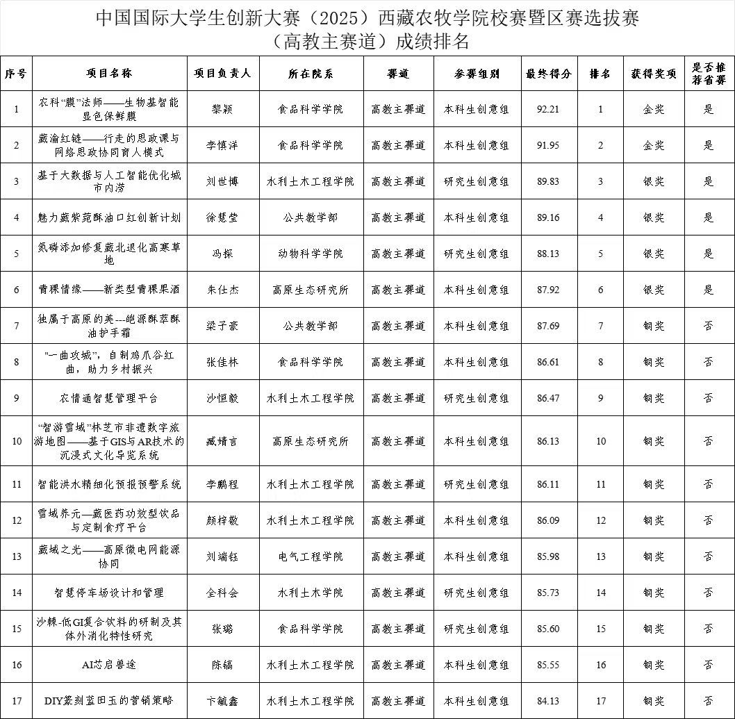 6月20日上午,我校举办2025年中国国际大学生创新大赛西藏农牧学院校赛暨区赛选拔赛。本次大赛共有32个优质项目进入校赛角逐。项目涵盖农牧科技、生态保护、人工智能等领域,充分展现了西藏农牧学院学子的创新活力与实践能力。