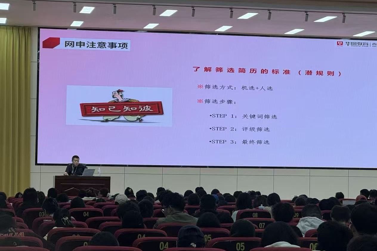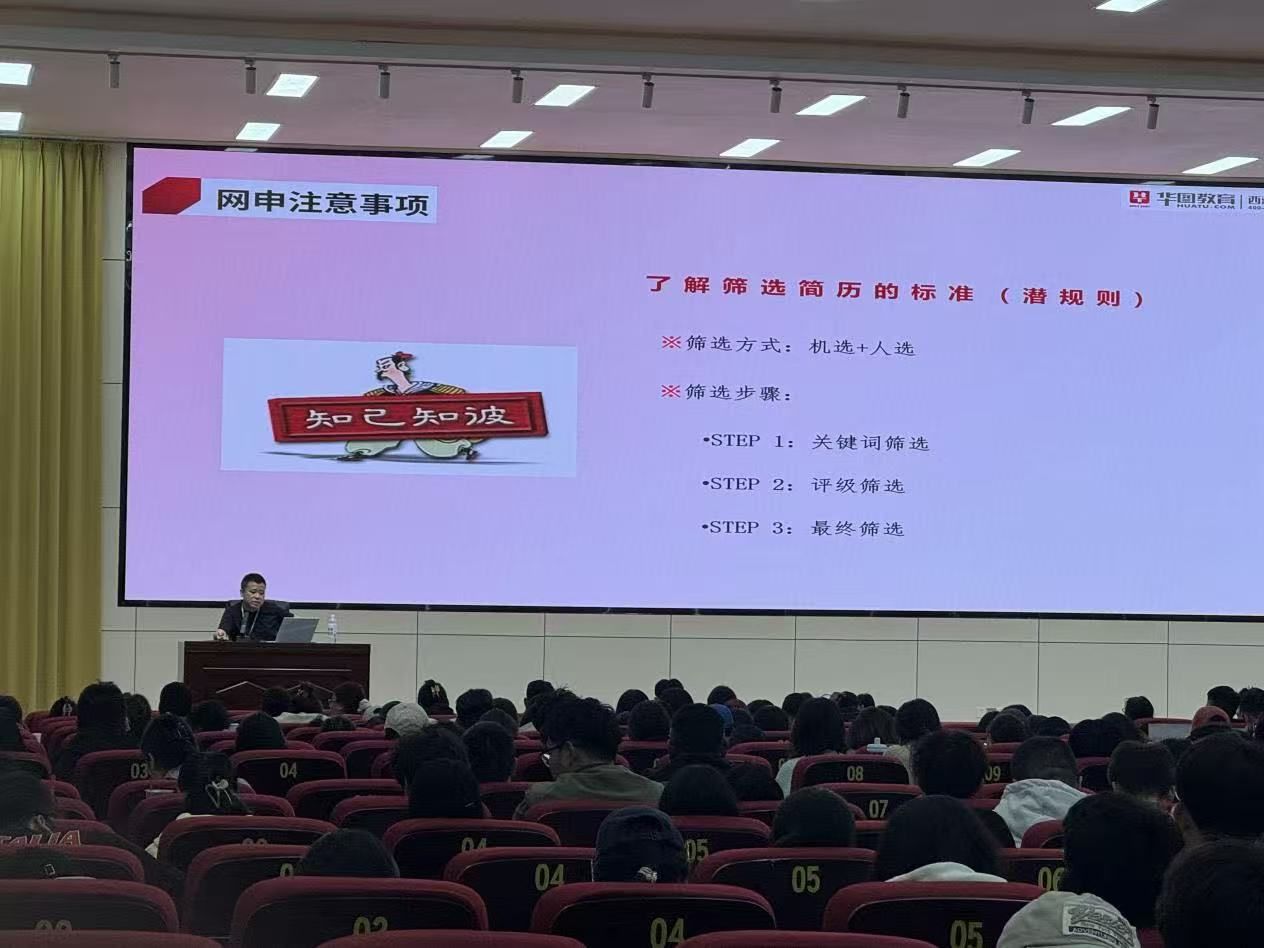 8月20日晚上,我校邀请华图教育科技有限公司成功举办了一场面向2026届毕业生的国央企就业指导讲座。本次讲座旨在帮助毕业生更好地了解国央企就业形势、掌握招聘流程、提升应聘能力,为其顺利就业提供有力支持。此次讲座共430余名师生参加,现场座无虚席,气氛热烈。