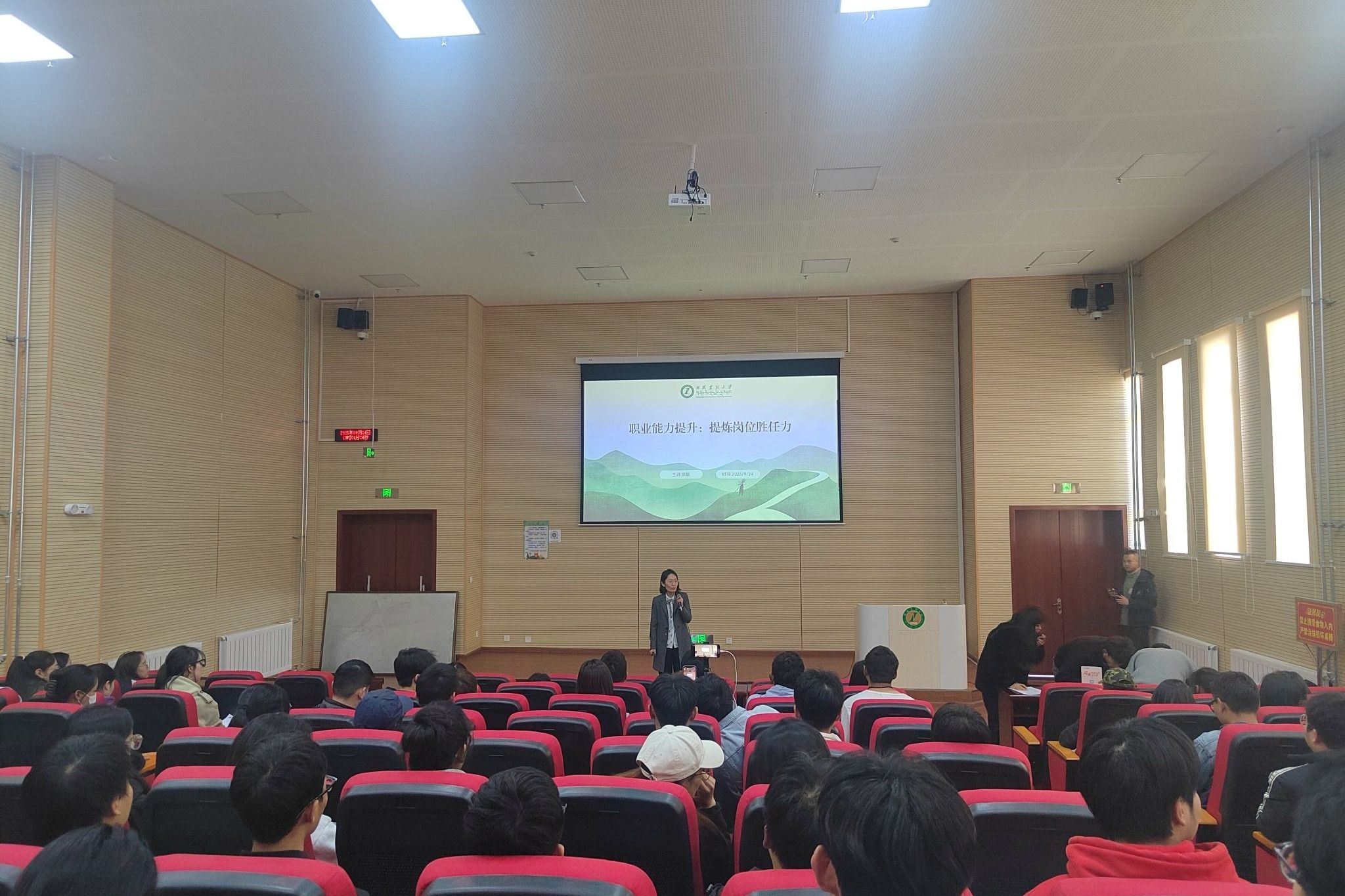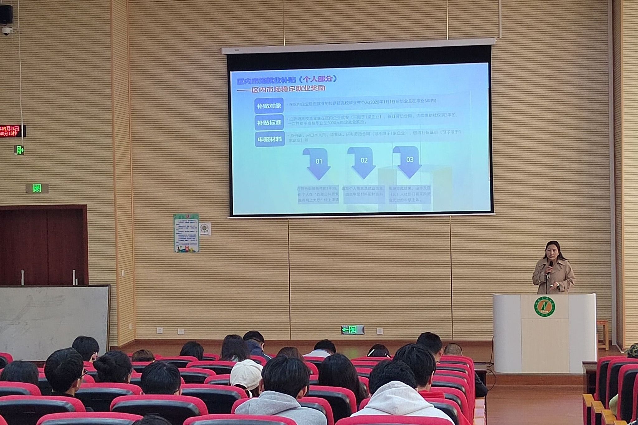 2025年9月24日上午,拉萨市人社局一行赴我校开展《职业跃升破茧计划》与《就创优才助赢未来之启航》系列活动。我校2026届150余名学生参加了宣讲活动。
