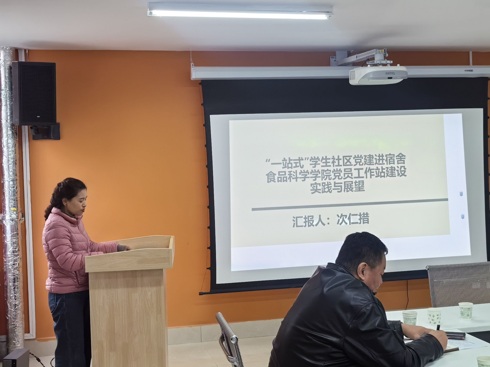 各学院负责学生党建辅导员以PPT形式从党员联系宿舍组织形式、工作情况、取得的成效及存在的问题等方面详细汇报了本单位“一站式”学生社区党建进宿舍工作开展情况。其中植物科学学院央拉以“党建引领聚合力、宿舍阵地筑根基”为主题汇报了本学院党建进宿舍工作特色亮点;动物科学学院殷巧介绍了增强了学生党员自我管理能力与服务意识,打通了服务同学“最后一公里”;食品科学学院次仁措针对学院党建进宿舍工作中存在的问题、难点进行了分享。其他学院老师也结合学院相关工作开展情况作了汇报。