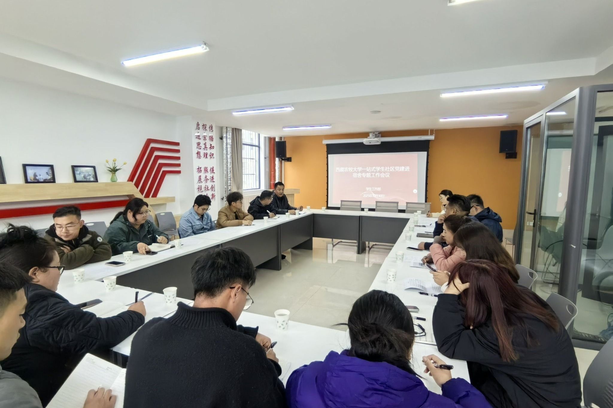 为推进党建进宿舍工作,引导学生积极参与学生社区管理,充分发挥学生党员先锋模范作用,2025年10月30日,学生工作部在“一站式”学生社区知行厅组织召开2025年度党建进宿舍专题工作会议。各学院负责学生党建辅导员、分管宿舍工作辅导员、大学生社区服务中心全体人员、党员工作站站长、楼(层)长代表等参加会议,会议由学生工作部副部长洛桑云旦主持。