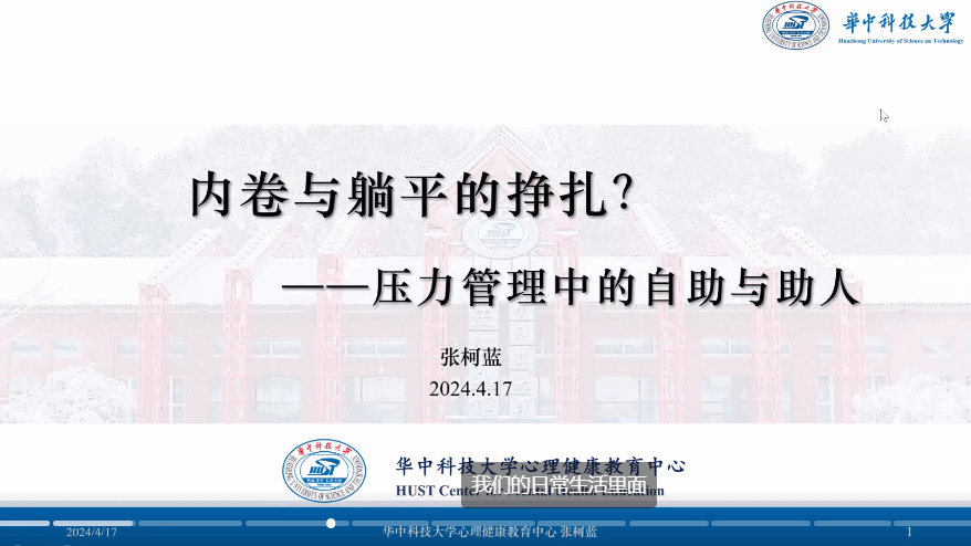 张柯蓝老师首先从朋辈互助的前提、心理自助的形式、压力管理及焦虑的表现形式等方面做了详细的阐述,引出了怎么去缓解情绪、缓解压力的方式,使用认知行为疗法调整认知来进行压力管理,还推荐了一些提升幸福感的策略,如积极态度、创造性解决问题、感恩、自我照顾等。张老师强调在遇到压力危机时,可以向外界寻求帮助,如找辅导员、专职心理咨询师等。在助人方面,作为学生,最核心要做的就是倾听,我知道他遇到了什么样的事情,我尽可能的去理解他;然后要注意一些和别人交流的非言语的行为,如目光的接触,如他讲述很难过的时候,调动自己的情绪跟着他,做到共情和理解。