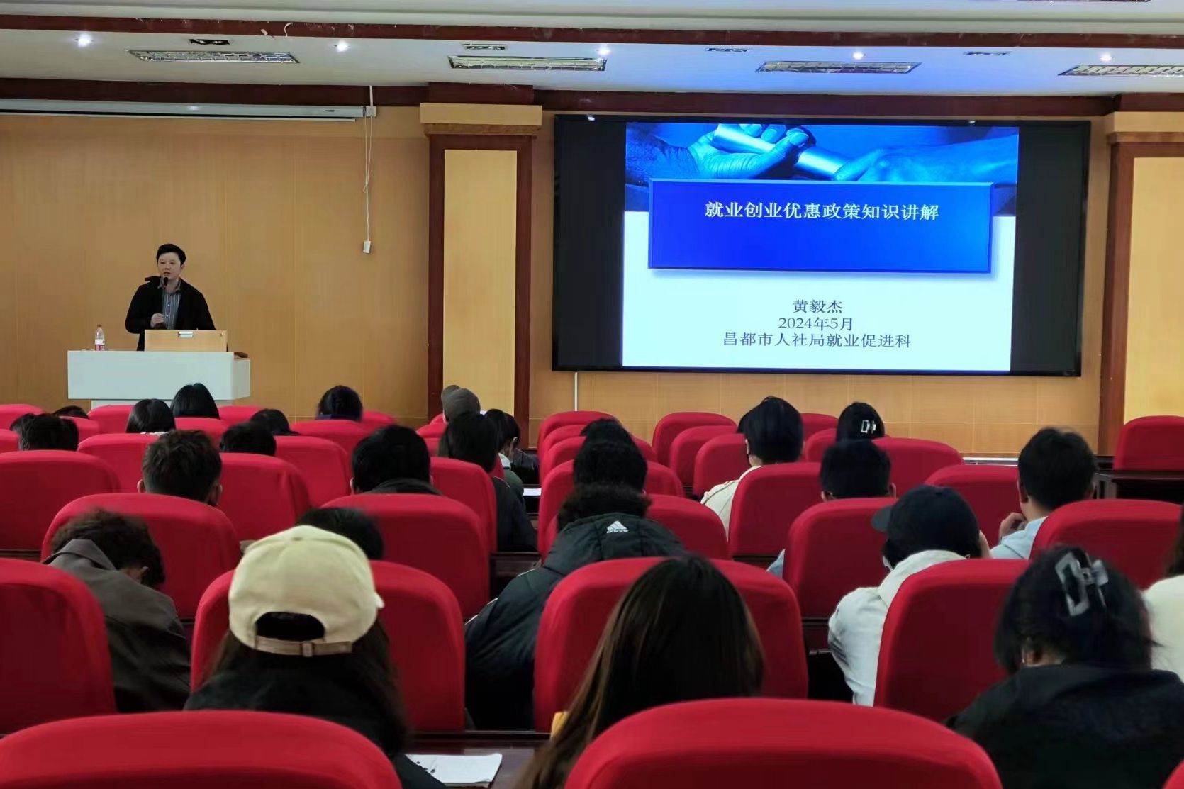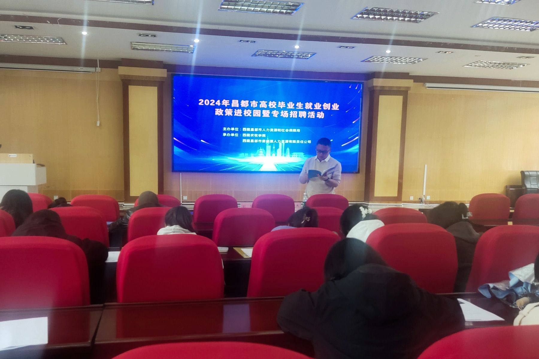 毕业季来临之际,为进一步加大高校毕业生就业创业政策宣传力度,提高政策知晓度,进一步深化高校毕业生就业创业政策宣传成效,促进昌都籍应届高校毕业生毕业与就业有效衔接,5月15日上午,由昌都市人力资源与社会保障局主办,西藏农牧学院和昌都市雾都源人力资源服务有限责任公司承办的“2024年昌都市高校毕业生就业创业政策进校园暨专场招聘活动”在我院研究生苑学术报告厅举办。昌都市人社局就业促进科黄毅杰和昌都市雾都源人力资源服务有限责任公司负责人刘俊一行人为我校100余名昌都籍应届高校毕业生进行政策宣讲,同时还提供了320个岗位信息,开展了现场招聘活动。