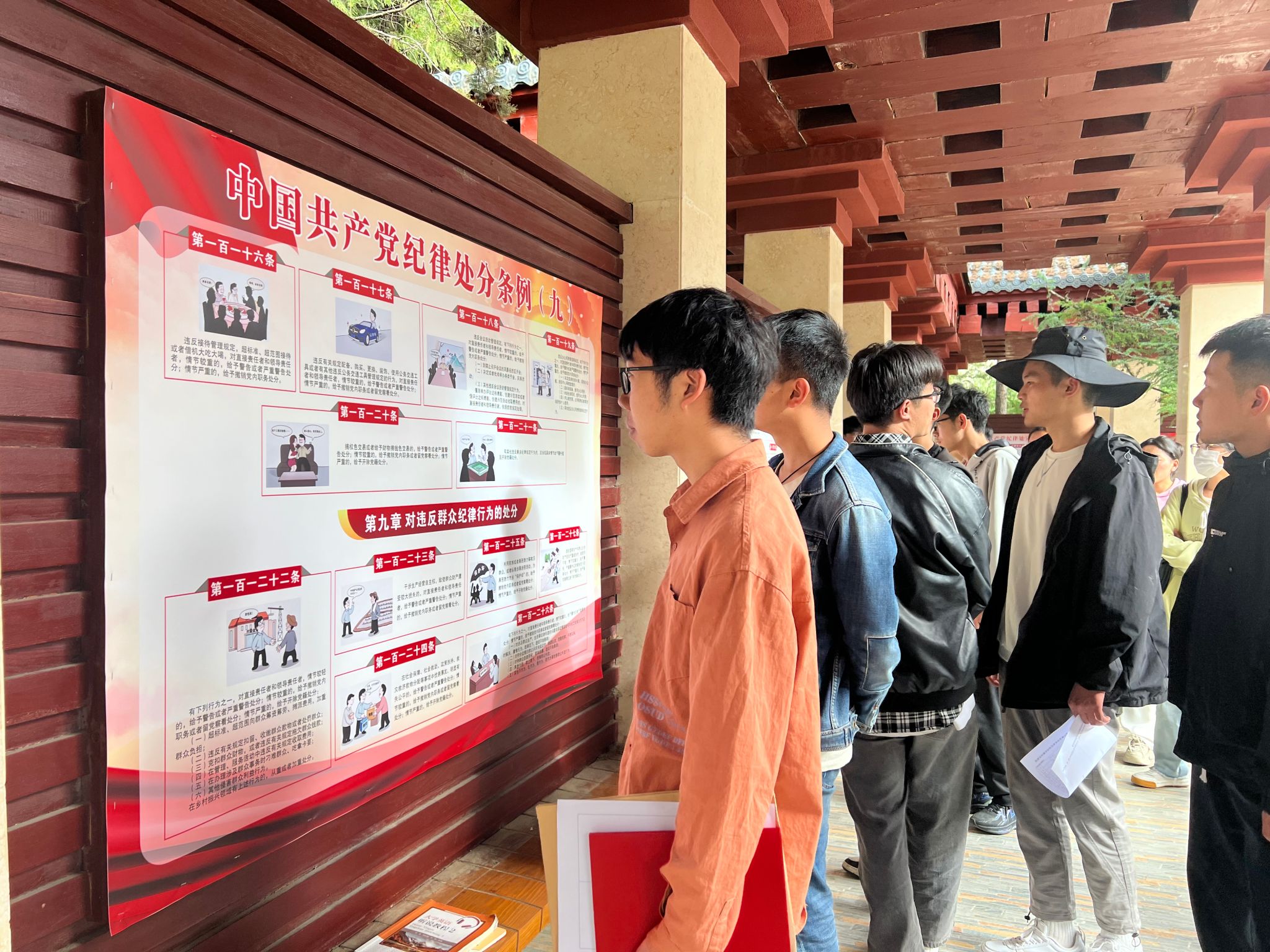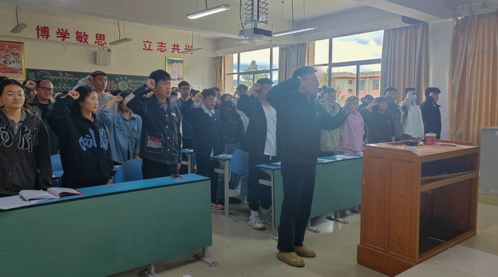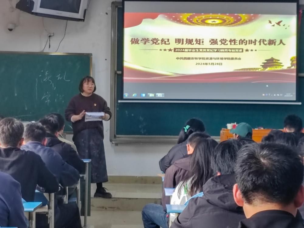 首先,和俐老师对同学们大学四年取得的成绩和即将开启人生新征程表示祝贺。然后,围绕“做学党纪 明规矩 强党性的时代新人”的主题开展学习教育。要求毕业生党员作为时代新人,要秉承“博学为农 精业兴藏”的校训,用所学知识建设祖国,建设西藏,做到戒骄戒躁,脚踏实地稳步前行。一是有追求,保持积极的、健康的、向上的状态;二是有正气,严纪守纪、抵制歪风邪气、敢于担当;三是有责任心,强化责任担当,对组织、单位和亲人负责;四是有标准,突出能力水平,发扬党员模范;五是有底线,老老实实做事,清清白白做人。随后,和俐老师对毕业生党员未来的学习工作生活提出几点希望:一是要增强党员意识,不负组织期望;二是要坚持不断学习,争创一流业绩;三是要在工作中应该正确对待利益,保持清正廉洁;四是要继续努力接受教育管理,加强党性修养;五是要在文明离校工作中起到模范带头作用。最后,由十佳毕业生刘家昌同学领誓,重温入党誓词。学习结束后,和俐老师带领大家参观了党纪学习教育文化长廊。