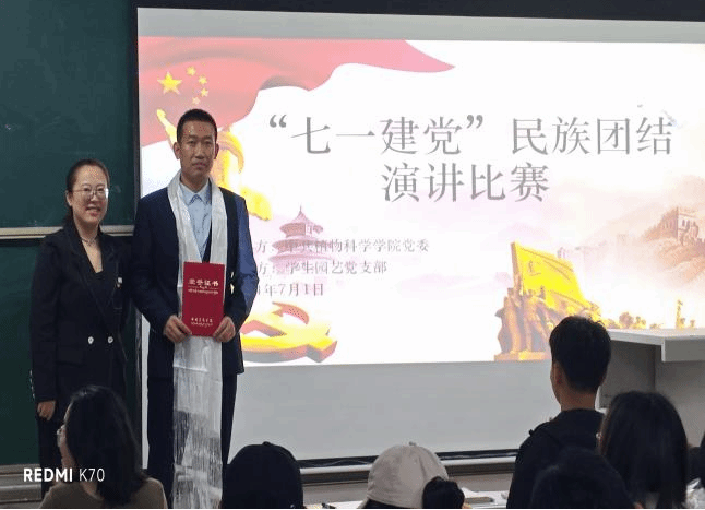 6月30日,学生园艺党支部在2310教室以演讲比赛的形式举办了庆祝建党103周年“铸牢中华民族共同体意识”主题党日活动。选手们紧扣演讲主题,声情并茂地深刻阐述校园里不同民族同学共同学习、生活、工作,不同民族同学宿舍混搭共创民族团结模范宿舍,不同民族同学团结奋进共建平安和谐校园的生动画面。又从各民族之间相互包容、相互理解、相互尊重、相互学习、共同进步到不断铸牢中华民族共同体意识,牢固树立国家意识、公民意识和法治意识的更高更广的角度,主张民族政策,宣讲共同体意识,倡导各民族像石榴籽一样紧紧抱在一起。通过举办主题演讲比赛,进一步加强了同学之间的交流沟通,增强了同学们的民族团结意识,增进了各民族同学之间的家国情怀、主人翁精神,激发了全班同学的爱党爱国、爱校爱院的热情,加深理解了加强民族团结的重要意义。