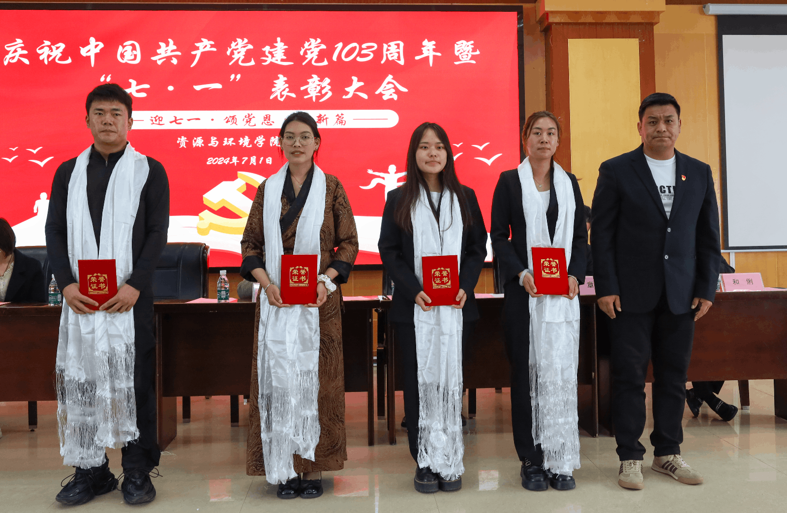 大会在嘹亮的《中华人民共和国国歌》中拉开序幕。首先,组织新党员入党宣誓、老党员重温入党誓词。由学生第二党支部书记和俐宣读48名新党员名单,学生第一党支部书记章国豪带领全体党员进行入党宣誓,老党员为新党员佩戴党徽,发放《中国共产党章程》。然后,新党员代表陈松焱发言。陈松焱在发言中说,“我会谨记组织上入党是一生一次,思想上入党是一生一世的誓词,在日常的学习生活中,我将对照党员的标准找出自我的差距,以高度的自觉性,正确认识自我,坚定信心,提升自我。”接着,学生第四党支部书记王凯宣读表彰名单,学院党委委员副院长王忠红、学生第三党支部书记平措顿珠分别为院级先进基层党组织——学生第一党支部、优秀共产党员——黄鑫、琼达卓玛、吴绿原、周玉柳、王瑞颁奖。随后,琼达卓玛作为优秀党员代表发言,呼吁党员同志再接再厉,决不辜负组织的殷切期望,永远牢记党和人民的哺育,珍惜荣誉、谦虚谨慎、再接再厉,以更加饱满的热情和更加坚定的信念,为党和人民的事业不懈奋斗。最后,学院党委书记次仁吉为全体党员讲话,要求新时代青年党员,要时刻牢记自己的党员身份,牢记习近平总书记的嘱托,坚定信念、践行宗旨、持续奋斗,始终保持共产党人的蓬勃朝气、昂扬锐气和浩然正气,为共产主义事业奉献青春和力量!至此,大会在《没有共产党就没有新中国》歌声中落幕!会后,学院党委书记一行还到学生宿舍慰问看望困难学生党员,了解学生急难愁盼的问题,让学生切实感受到党的关怀和温暖,引导青年学生党员学习先辈们艰苦奋斗、无私奉献的精神。