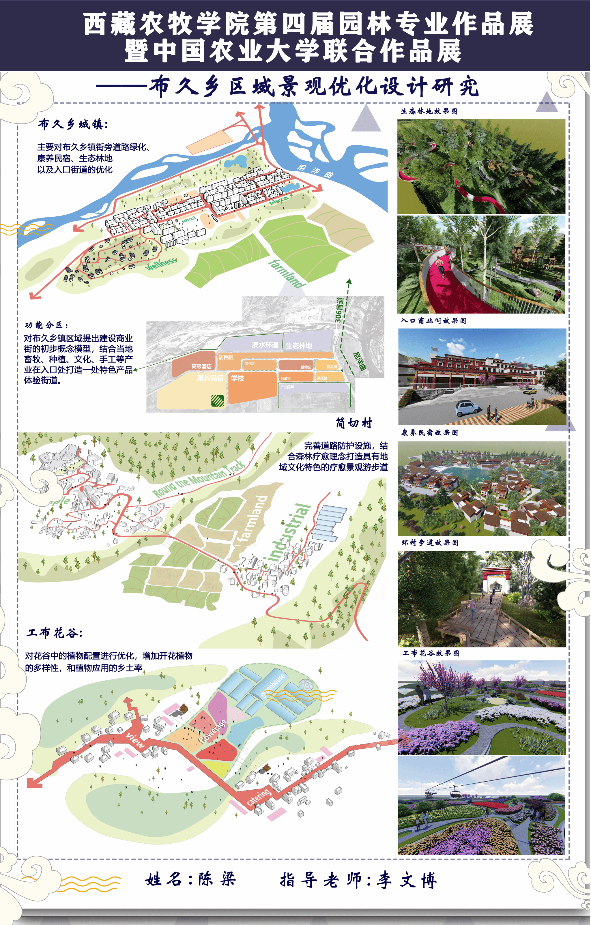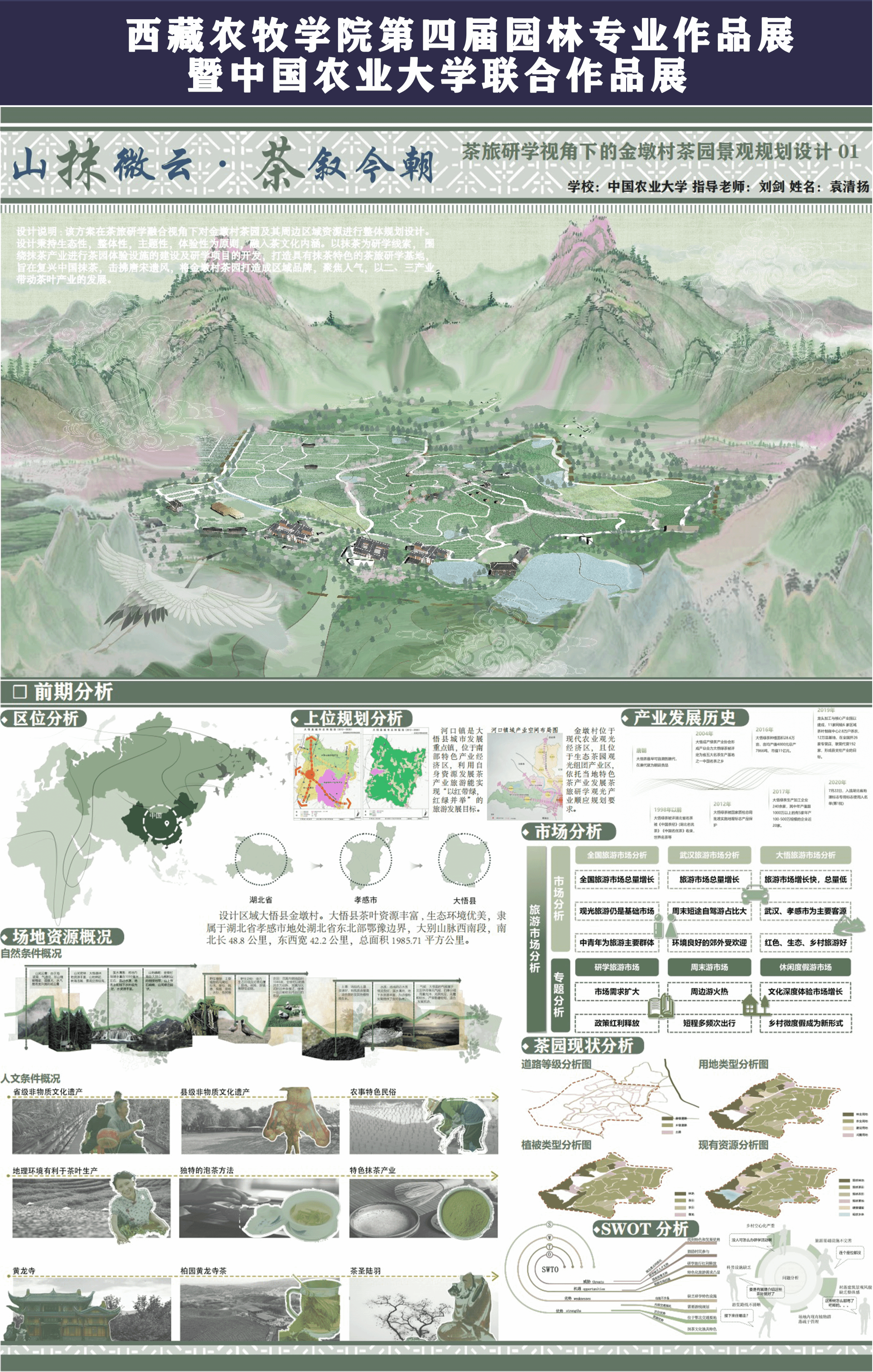 本次作品展,主题为“绿水青山、人居生态环境”,共选取两校园林专业部分学生的24件优秀设计作品进行展出,主要包含大尺度城市规划设计、乡村规划设计、小尺度城市设计和乡村振兴等内容。