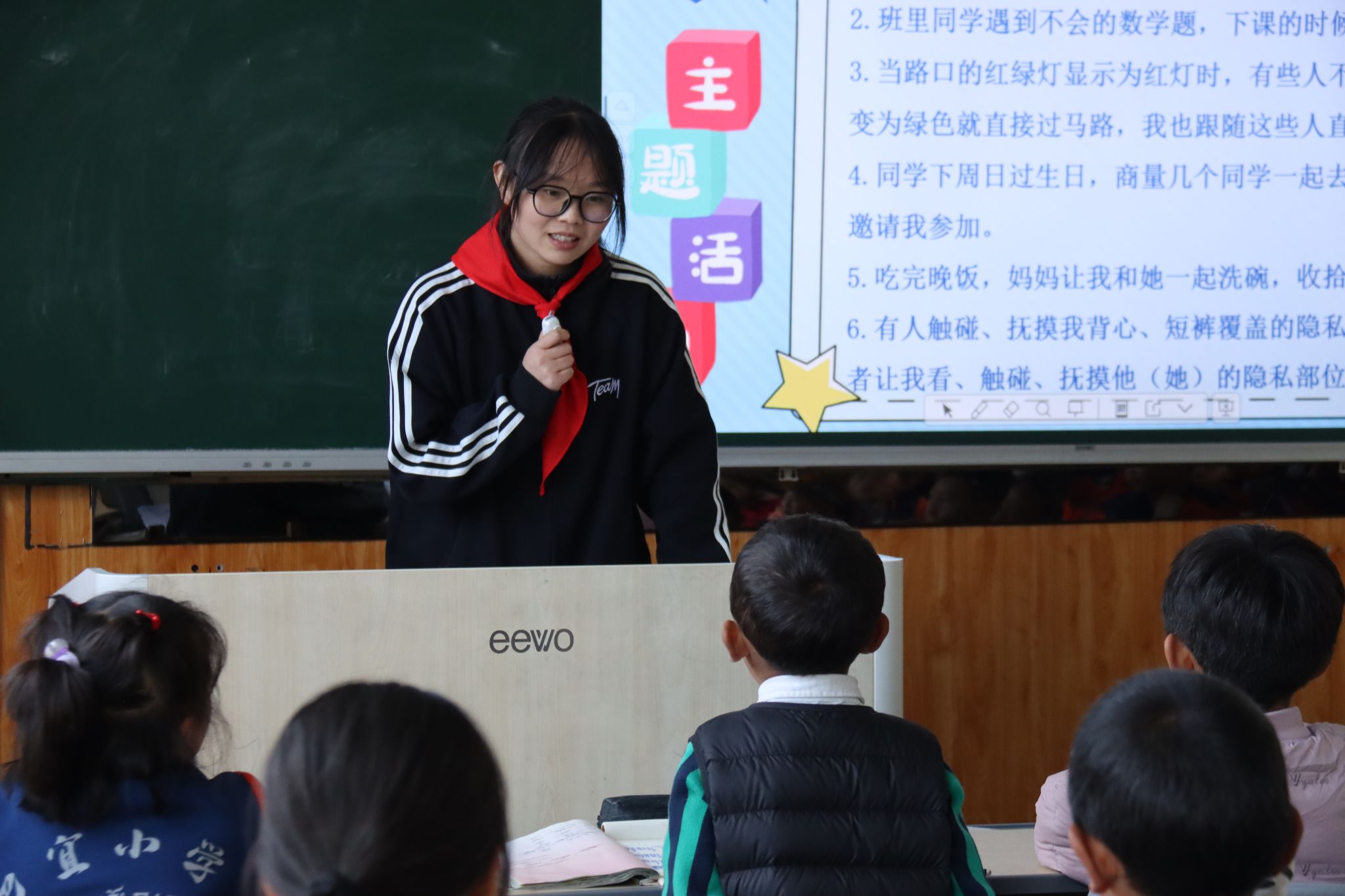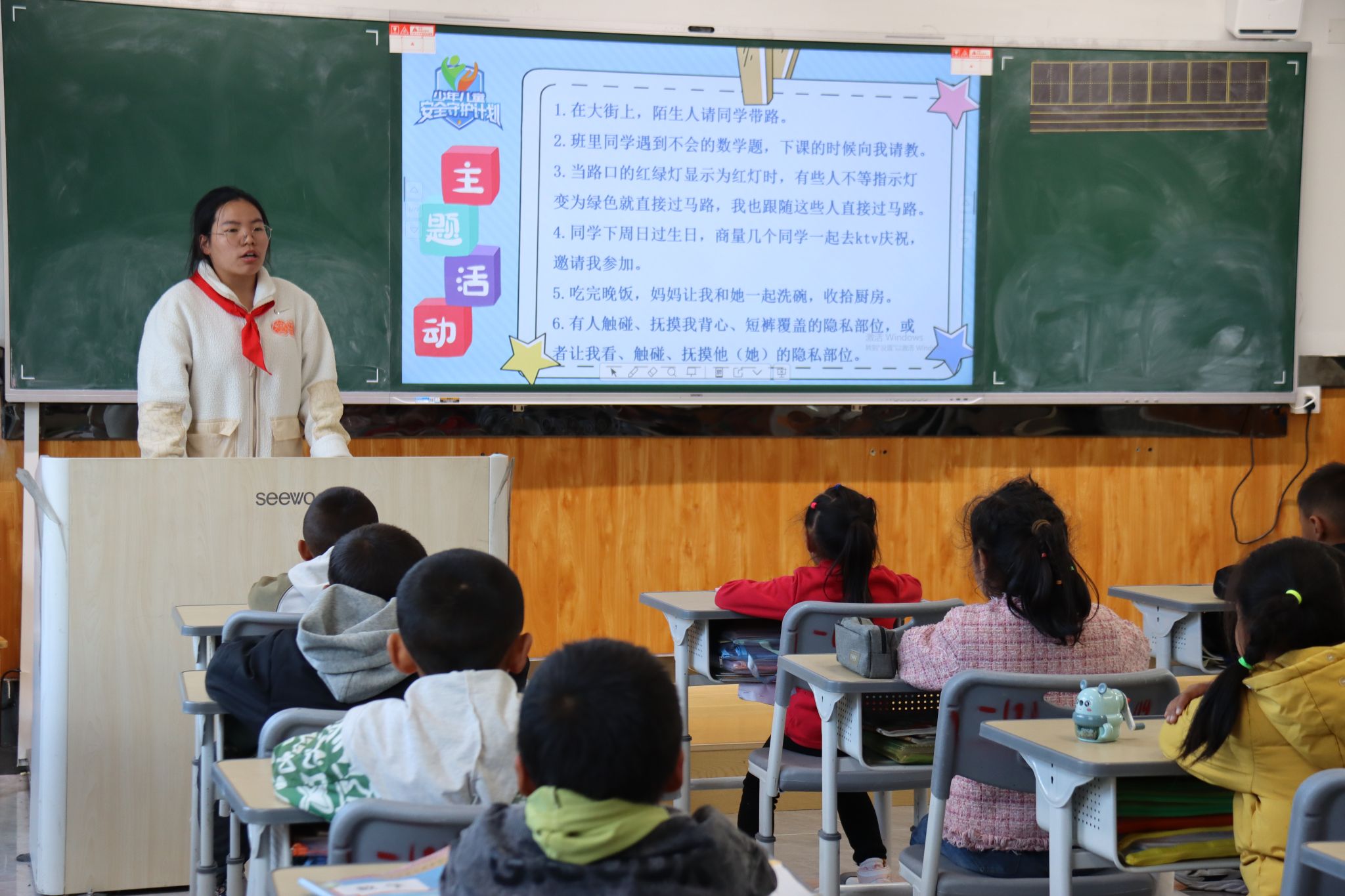宣传队员通过预防侵害课程PPT,向同学们详细讲解生活中常见的侵害类型与形式,并引导孩子们注意日常生活中常见的交通安全问题与卫生防护问题;通过播放拐卖儿童、拨打急救电话等视频,让孩子们更加了解生活中需要注意和警惕的各种风险场景,并向孩子们普及日常生活中常见的报警电话,以及遇到突发事故时需要注意的报警信息和报警要点;通过互动问答及情景再现等形式,切实让孩子们明白在发生突发事故时应当如何报警、避险。活动最后,宣传队员通过交流讨论与课堂随机提问等互动环节,让孩子们认识到生活中的侵害来源,掌握预防意外伤害、不良侵害等安全防护知识。